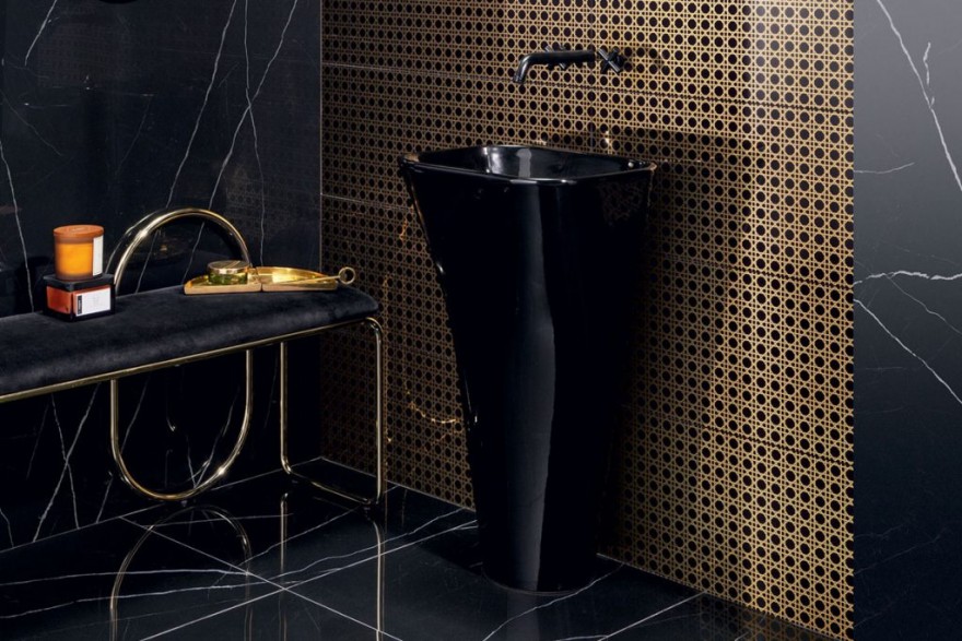 wielkoformatowe o błyszczącej powierzchni – mogą to być np. nowoczesne płytki ścienne tzw. monoporoza. Warto wybrać rektyfikowane dające możliwość układania z minimalna fugą – powierzchnia okładziny będzie wówczas bardziej jednolita. Światło odbite od błyszczącej powierzchni płytek dekoruje przestrzeń i podkreśla minimalistyczną formę wnętrza. Nawet czarne płytki na wysoki połysk nie pomniejszają optycznie pomieszczenia! Efekt wysokiego połysku można też uzyskać sięgając po rozświetlające przestrzeń płytki z lustrzanym rysunkiem dekoracji lub mozaikę np. z elementów w kształcie rybich łusek o lustrzanej powierzchni. Połyskujące powierzchnie mają też płytki z elementami dekoracyjnymi w kolorze złotym.