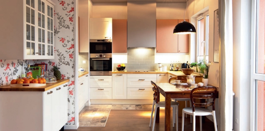 Zdj 4. Dzięki usytuowaniu pionu wodno-kanalizacyjnego w narożniku kuchni udało się uniknąć umieszczenia szafki narożnej. Aspekt wygody podyktował również wybór płyty kuchennej na 6 palników, która pomieści nawet 2 patelnie lub dużego woka.